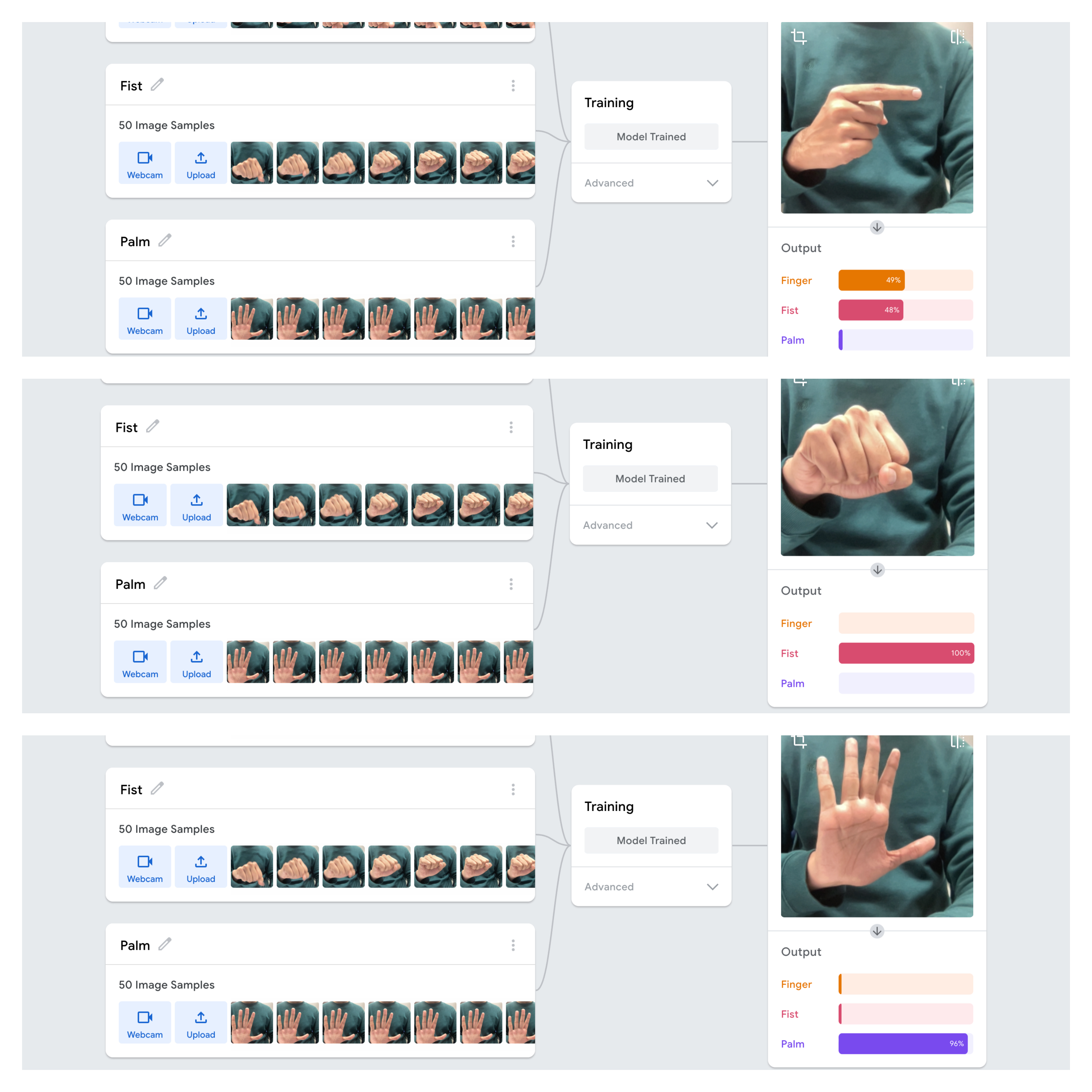 Working with Teachable Machine to train a model which recognizes three distinct hand gestures—fist, palm, and finger pose—was both an insightful and frustrating experience. Despite using 50 images for each gesture, the model correctly identified the fist and palm gestures but struggled with the finger pose. This issue, while technical on the surface, goes deeper into how predictive technologies tend to simplify and categorize human behaviours, often overlooking complexity. Drawing from auto-essentialization as discussed in Scheuerman, Pape, and Hanna’s paper on facial recognition and gender, I realized that my project mirrors the way AI systems can unintentionally ignore or misrepresent certain expressions or identities.